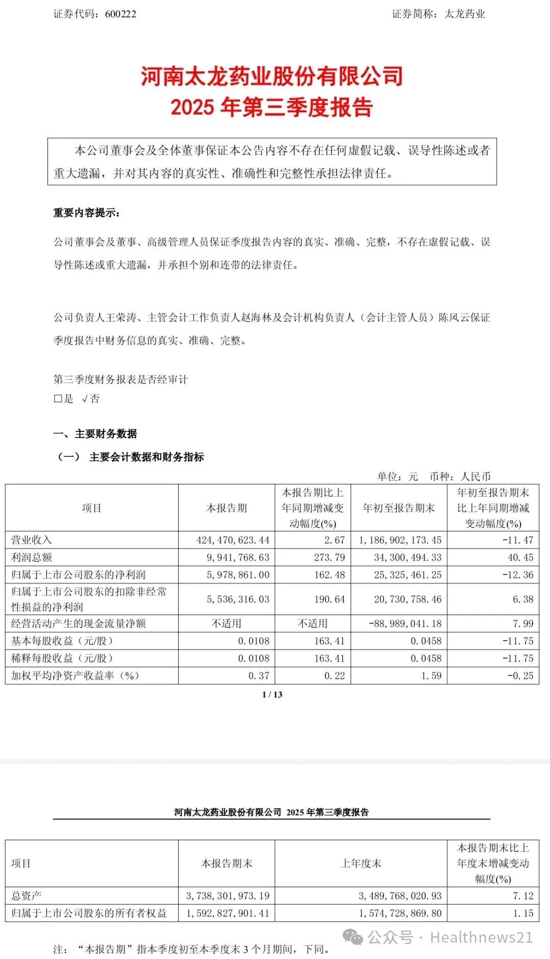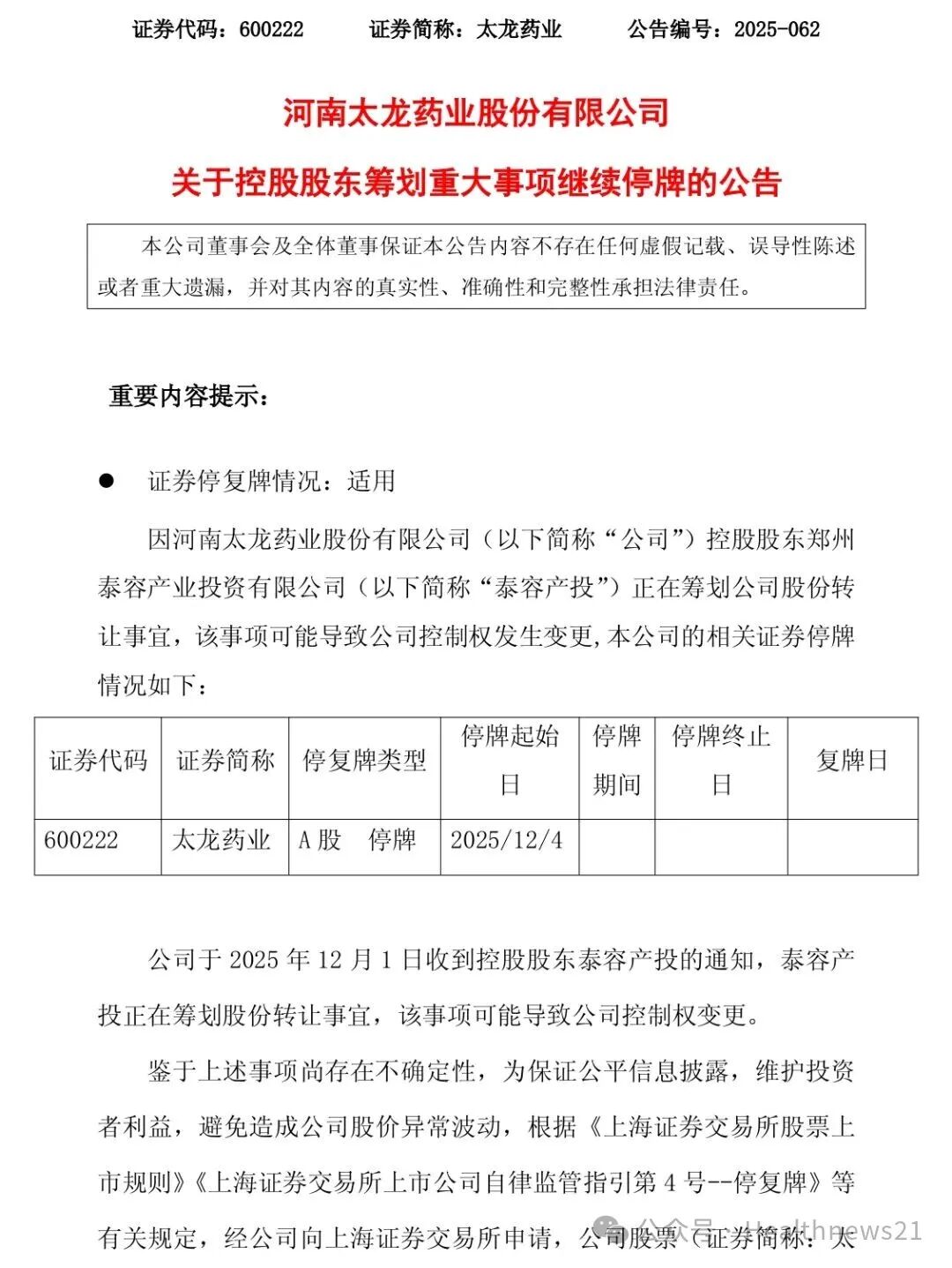 作者/闫 硕炒股股票平台 编辑/季媛媛 受全国流感活动快速上升等因素的影响,手握双黄连口服液的太龙药业(600222)最近股价持续走高,但也是在此时刻,公司选择了停牌。 日前,太龙药业公告称,控股股东郑州泰容产业投资有限公司(简称“泰容产投”)正在筹划公司股份转让事宜,该事项可能导致公司控制权发生变更。因此,公司于12月2日开市起停牌,预计停牌时间不超过2个交易日。 ![]() 这意味着,国资入主未满四年,太龙药业的控制权或再次发生变更。 2021年11月29日,郑州众生实业集团有限公司(简称“众生实业”)与泰容产投签署股份转让协议,拟通过非公开协议转让方式向泰容产投转让其持有的公司8244万股股份,占公司总股本的14.37%。需要说明的是,泰容产投为郑州高新产业投资集团为收购太龙药业股份,于2021年11月专门设立的主体。 在上述转让日前,因转让、二级市场减持、送股、资本公积转增、定增、司法拍卖等原因,公司控股股东众生实业持有公司股权比例变更为23.08%。转让后,众生实业持有公司8.71%股份,公司控股股东由众生实业变更为泰容产投,实际控制人由巩义市竹林镇人民政府变更为郑州高新技术产业开发区管委会。 目前,众生实业持有的太龙药业全部5000万股份,由于金融借款合同纠纷,均处于质押状态。另据公司半年报,控股股东泰容产投也质押公司股份4122.06万股用于融资,约占泰容产投所持有公司股份总数的50%。这或将对股份转让流程产生潜在影响。 官方信息显示,太龙药业设立于1998年,前身为河南竹林众生制药股份有限公司,于1999年11月登陆上交所。其主要业务为药品制造和药品研发服务,具体包含药品制剂、中药饮片、药品研发服务和药品药材流通四个业务板块。 近年来,太龙药业的药品制造业务一直是贡献较大的自营业务,占公司整体销售额的75%以上,并呈进一步增长的趋势。其中,公司核心产品双黄连口服液多次被相关部门列入重大疫情诊疗方案的推荐用药,是应对呼吸道传染性公共卫生事件的代表性用药之一。 自今年10月底以来,受流感等因素影响,太龙药业股价持续上涨,至停牌前一天的12月1日涨幅超30%,其中11月11日实现盘内涨停。停牌前一天,太龙药业报价8.58元/股,总市值约49.24亿元。 股价虽在上涨,但营收却在承压。2024年,太龙药业实现19.41亿元的营收,同比下降6.21%,2025年前三季度,营收又延续了这一下降趋势,为11.87亿元,同比下降11.47%。 对于今年前三季度营收的下滑,太龙药业在业绩说明会上指出,主要系公司主要产品参加全国中成药集采的执标工作尚未全面覆盖,“以价换量”效果未能充分显现,叠加零售端药店整合、医保支付改革及执标产品价格体系维护的影响,销售收入下降。 从中标公告看,太龙药业的丹参口服液和独家产品双黄连口服液(儿童型)于2024年底中标第三批全国中成药集采。 另外,2025年2月,太龙药业的全资子公司桐君堂在全国中药饮片采购联盟集中采购中成功中标36个品种,63个品规,中标区域覆盖浙江、河南、山东等多个省市。而中药饮片在公司药品制造板块收入中占比最大,2022-2024年,中药饮片收入占该板块收入的比重分别为63.88%、57.50%、64.16%。“以价换量”也有待释放。 净利润方面,2022-2024年度及2025年前三季度,太龙药业净利润分别为-0.76亿元、0.45亿元、0.53亿元和0.30亿元,同比增长-1216.98%、159.17%、19.33%、1.76%。虽然2023年止住了2020-2022年净利润的连续下降,并实现扭亏为盈,但2023-2025年前三季度的增速有所放缓。 ![]() 12月4日,太龙药业将迎复牌后首个交易日,股份转让进展值得关注。 图片/21图库 排版/许秋莲 【版权声明】本文所有内容著作权归属21世纪经济报道,未经许可,不得转载、摘编或以其他形式使用。- END -